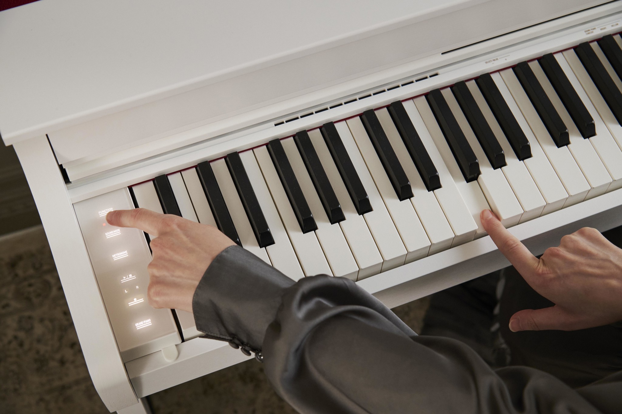 Zusätzliche Funktionen: Anschlagdynamik: 3 Stufen, Aus, Transponierfunktion: 2 Oktaven (-12 bis 0 bis +12), Stimmfunktion: 415,5 Hz bis 440,0 Hz bis 465,9 Hz (0,1 Hz Schritte), Temperierung: gleichstufig + 16 weitere Stimmungen, Oktavverschiebung: 4 Oktaven (-2 bis 0 bis +2), Bedientafelsperre: Ja